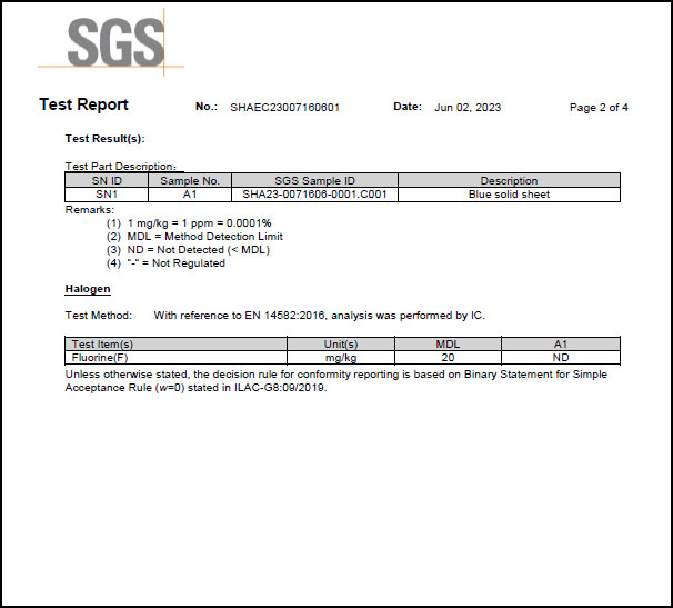 為滿足客戶需求,近日SealTex索拓 ST-2058無石棉板通過了SGS進行的鹵素(氟)檢測,檢測標準EN 14582-2016,報告顯示未測出氟,報告部分截圖如下: